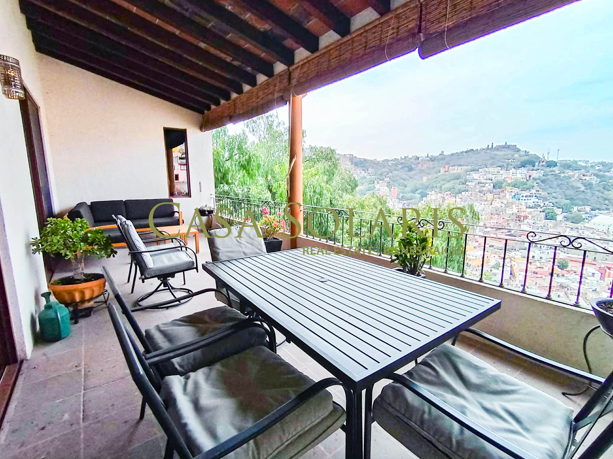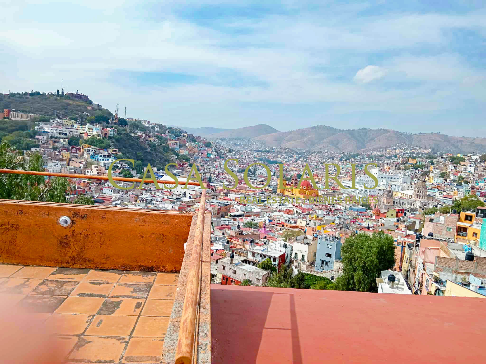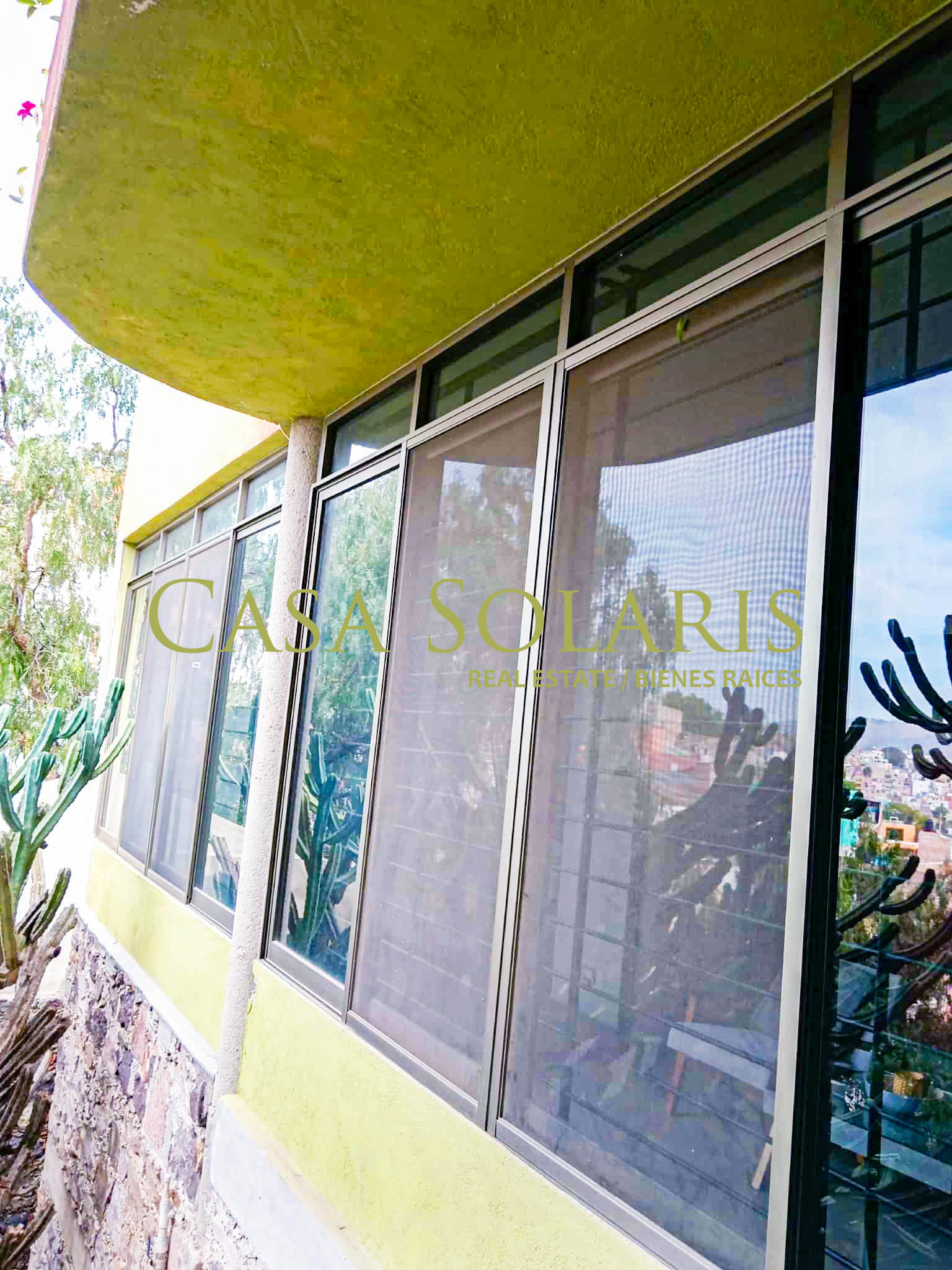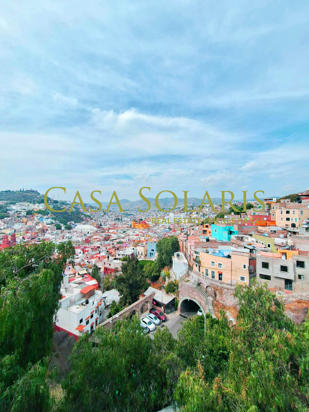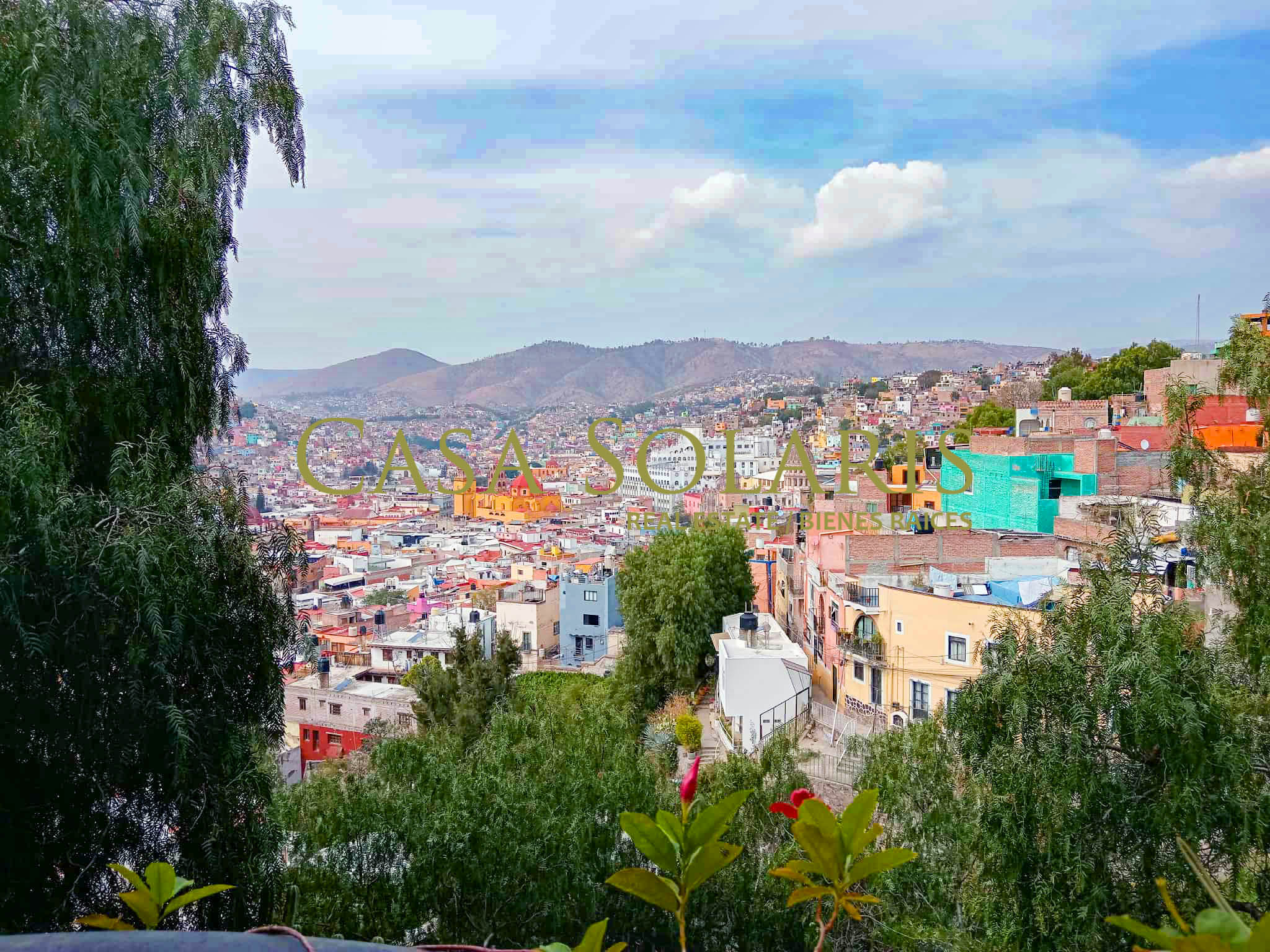 Oportunidad de residencia amueblada y equipada, en venta ubicada en una parte alta donde se aprecia de forma increíble una vista del Centro de la ciudad de Guanajuato, con sus edificios emblemáticos: teatro Juárez, La Basílica, la Universidad, el mercado Hidalgo, el monumento al Pípila. Se ubica arriba del túnel noreste y para llegar a ella se disfruta el recorrido de un jardín con mucha vegetación y árboles. Cuenta con dos propiedades en el terreno, una casa y un departamento independiente. La casa con dos terrazas exteriores con vistas fabulosas tanto de día como de noche. Detalles de construcción la hacen muy especial como amplias bóvedas en una recámara y otra hermosa bóveda de cañón corrido que cubre el espacio de cocina y comedor, acabados rústicos, azulejo de talavera en los baños, y una bellísima escalera con piso de madera que conecta los pisos. Tiene una amplia cocina con mucha luz. Cuenta con dos recámaras en la primera planta, baño con centro de lavado, baño completo, terraza al frente y amplio jardín en la parte trasera. Se sube a la segunda planta donde se encuentra la alargada cocina para deleite de los que les agrada preparar comida, el comedor, un baño, La tercera planta es una terraza, donde se puede construir un departamento. El departamento se encuentra en la parte inferior de la casa, en una sola planta, con dos recámaras, cocina, sala y comedor, un baño y medio. Muy funcional, cómodo y equipado para tener una estadía muy confortable. La propiedad se emplea como negocio de bed&breakfast, por lo que también se puede seguir rentando con una buena ganancia, y tiene un historial muy rentable. Una gran oportunidad por su cercanía a la parte nuclear de la zona centro y por el estilo arquitectónico colonial moderna y la espectacular vista panorámica.