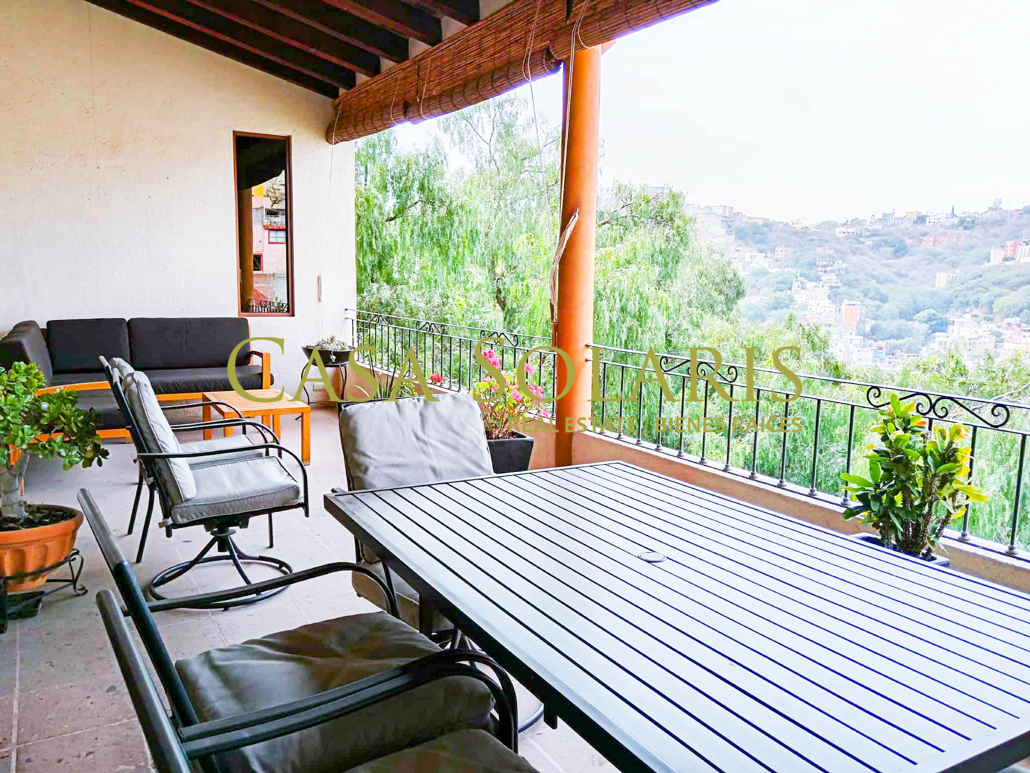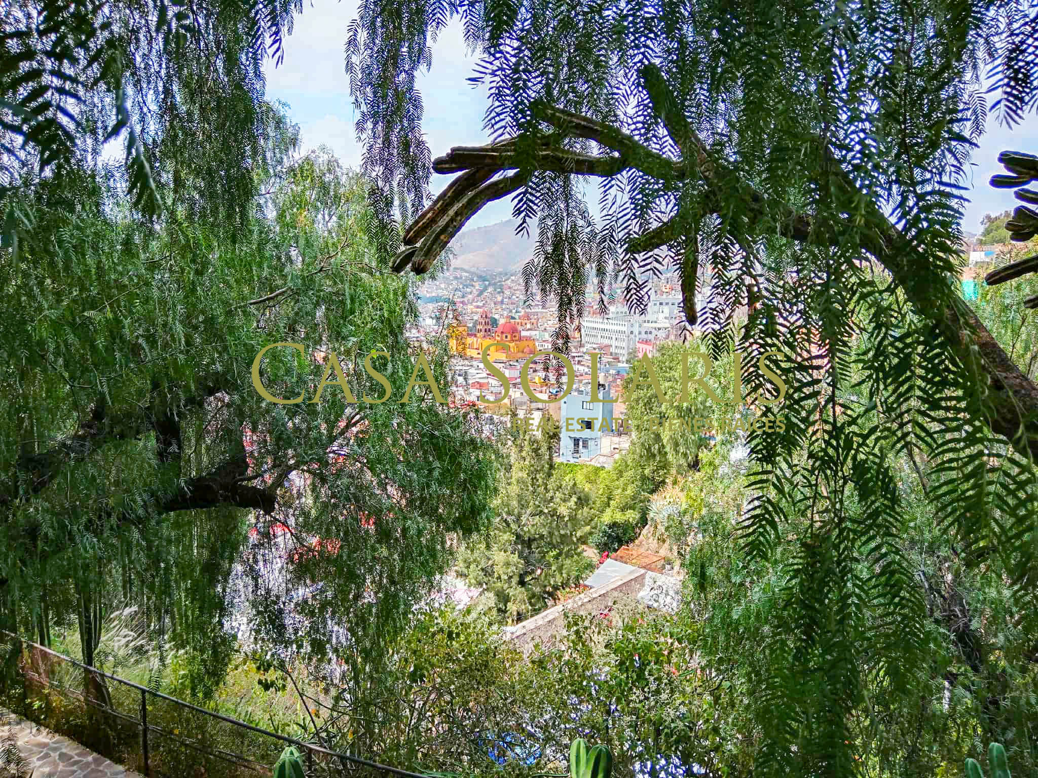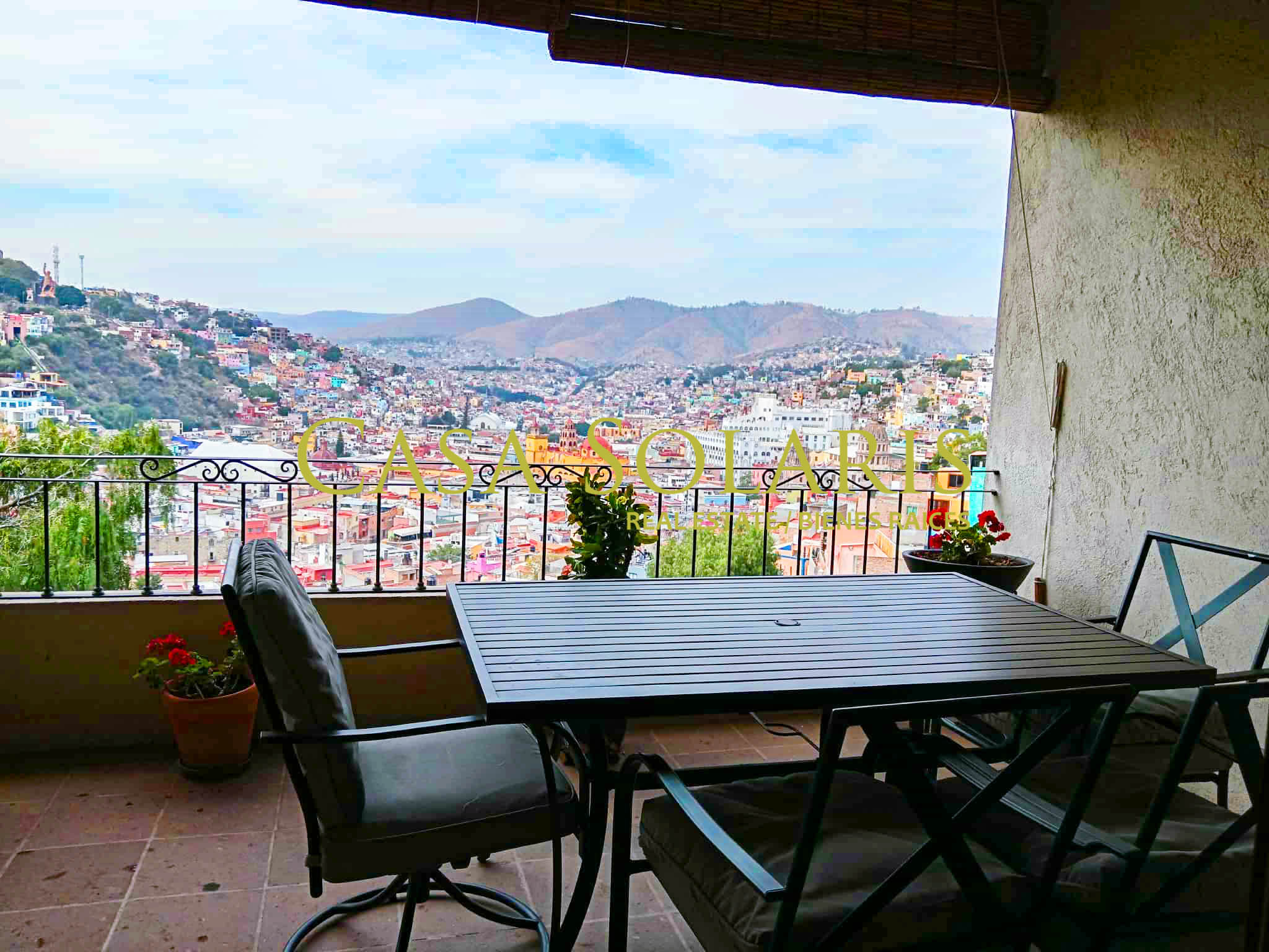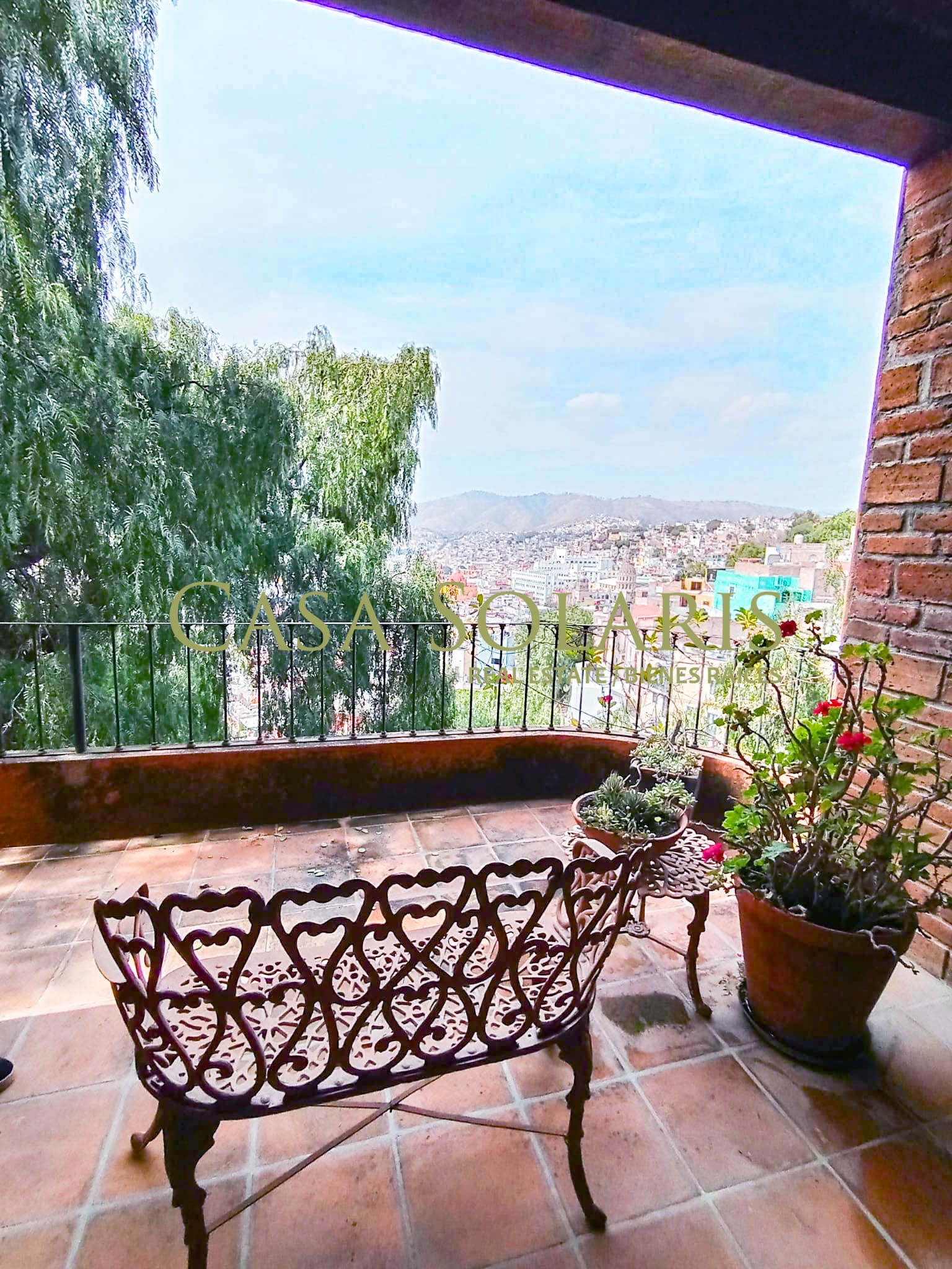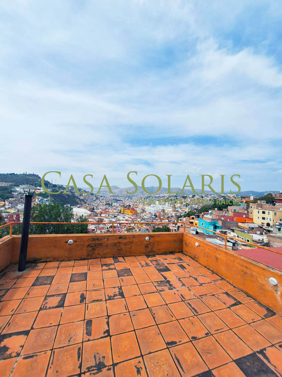Oportunidad de residencia amueblada y equipada, en venta ubicada en una parte alta donde se aprecia de forma increíble una vista del Centro de la ciudad de Guanajuato, con sus edificios emblemáticos: teatro Juárez, La Basílica, la Universidad, el mercado Hidalgo, el monumento al Pípila. Se ubica arriba del túnel noreste y para llegar a ella se disfruta el recorrido de un jardín con mucha vegetación y árboles. Cuenta con dos propiedades en el terreno, una casa y un departamento independiente. La casa con dos terrazas exteriores con vistas fabulosas tanto de día como de noche. Detalles de construcción la hacen muy especial como amplias bóvedas en una recámara y otra hermosa bóveda de cañón corrido que cubre el espacio de cocina y comedor, acabados rústicos, azulejo de talavera en los baños, y una bellísima escalera con piso de madera que conecta los pisos. Tiene una amplia cocina con mucha luz. Cuenta con dos recámaras en la primera planta, baño con centro de lavado, baño completo, terraza al frente y amplio jardín en la parte trasera. Se sube a la segunda planta donde se encuentra la alargada cocina para deleite de los que les agrada preparar comida, el comedor, un baño, La tercera planta es una terraza, donde se puede construir un departamento. El departamento se encuentra en la parte inferior de la casa, en una sola planta, con dos recámaras, cocina, sala y comedor, un baño y medio. Muy funcional, cómodo y equipado para tener una estadía muy confortable. La propiedad se emplea como negocio de bed&breakfast, por lo que también se puede seguir rentando con una buena ganancia, y tiene un historial muy rentable. Una gran oportunidad por su cercanía a la parte nuclear de la zona centro y por el estilo arquitectónico colonial moderna y la espectacular vista panorámica.
