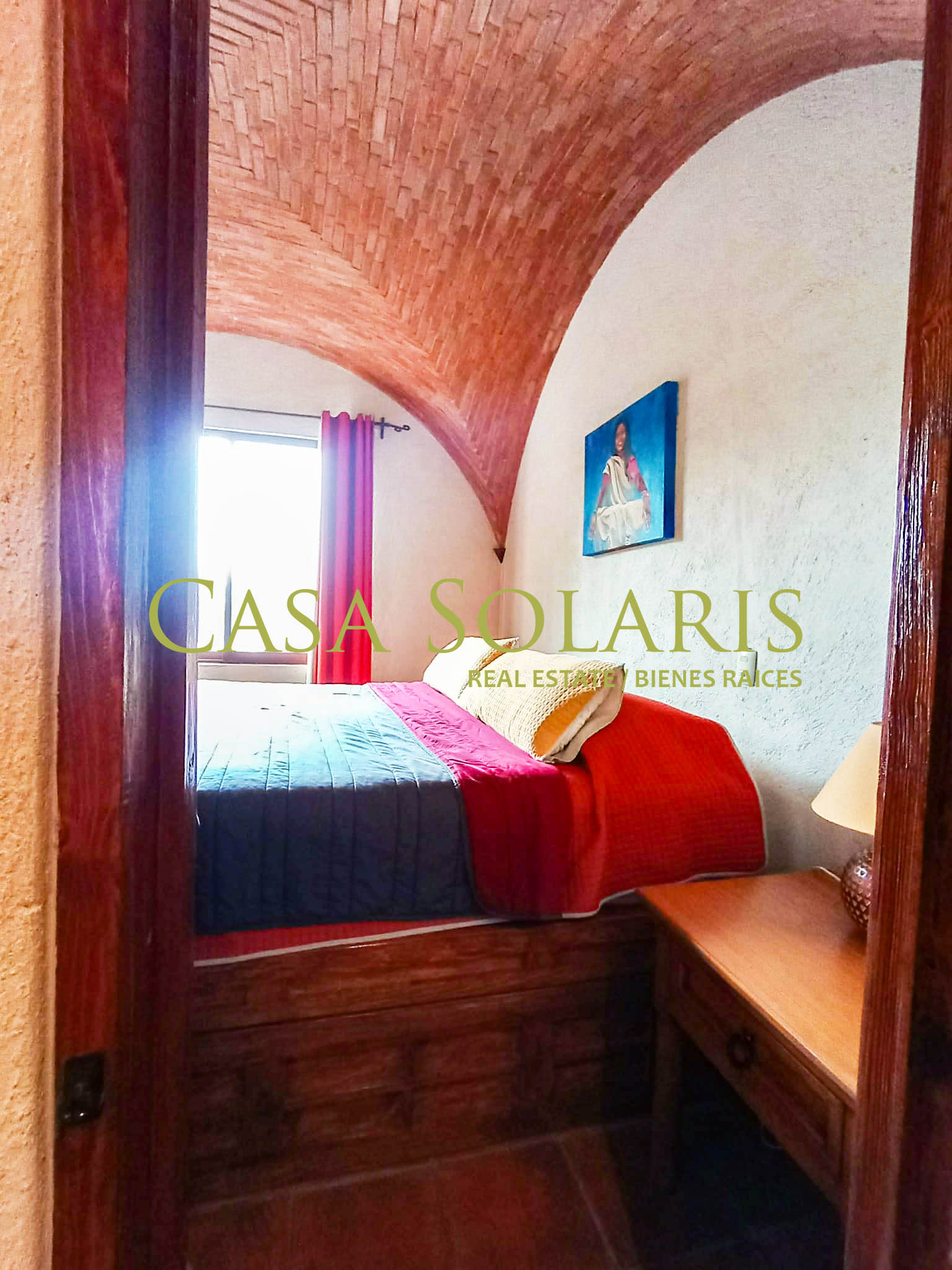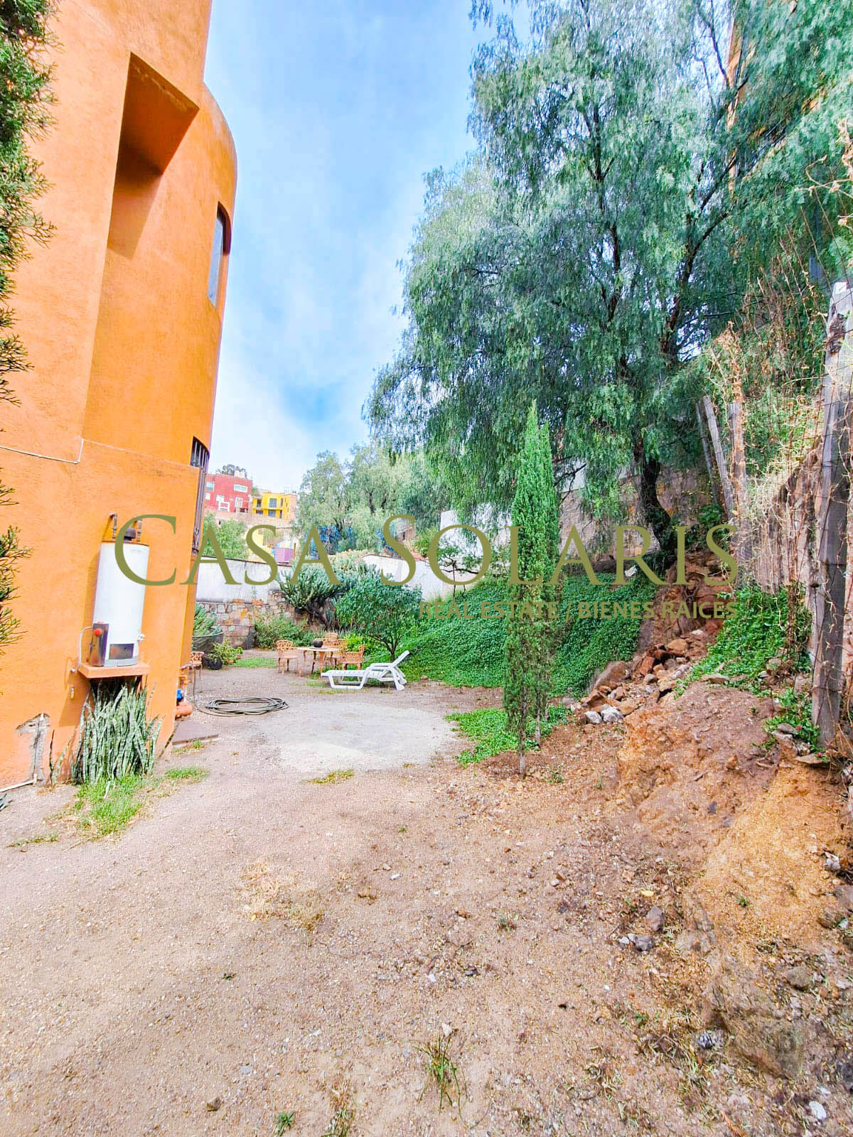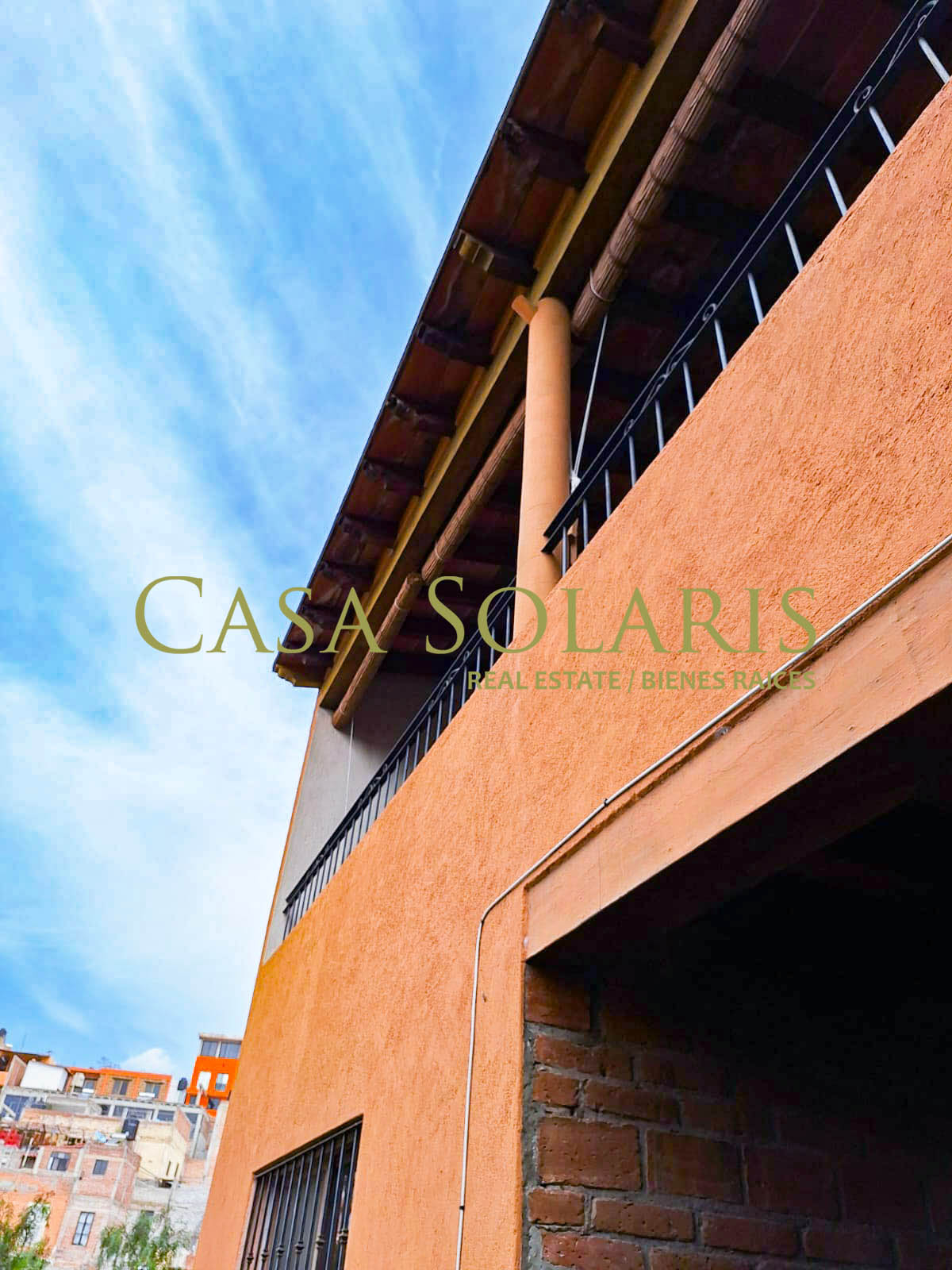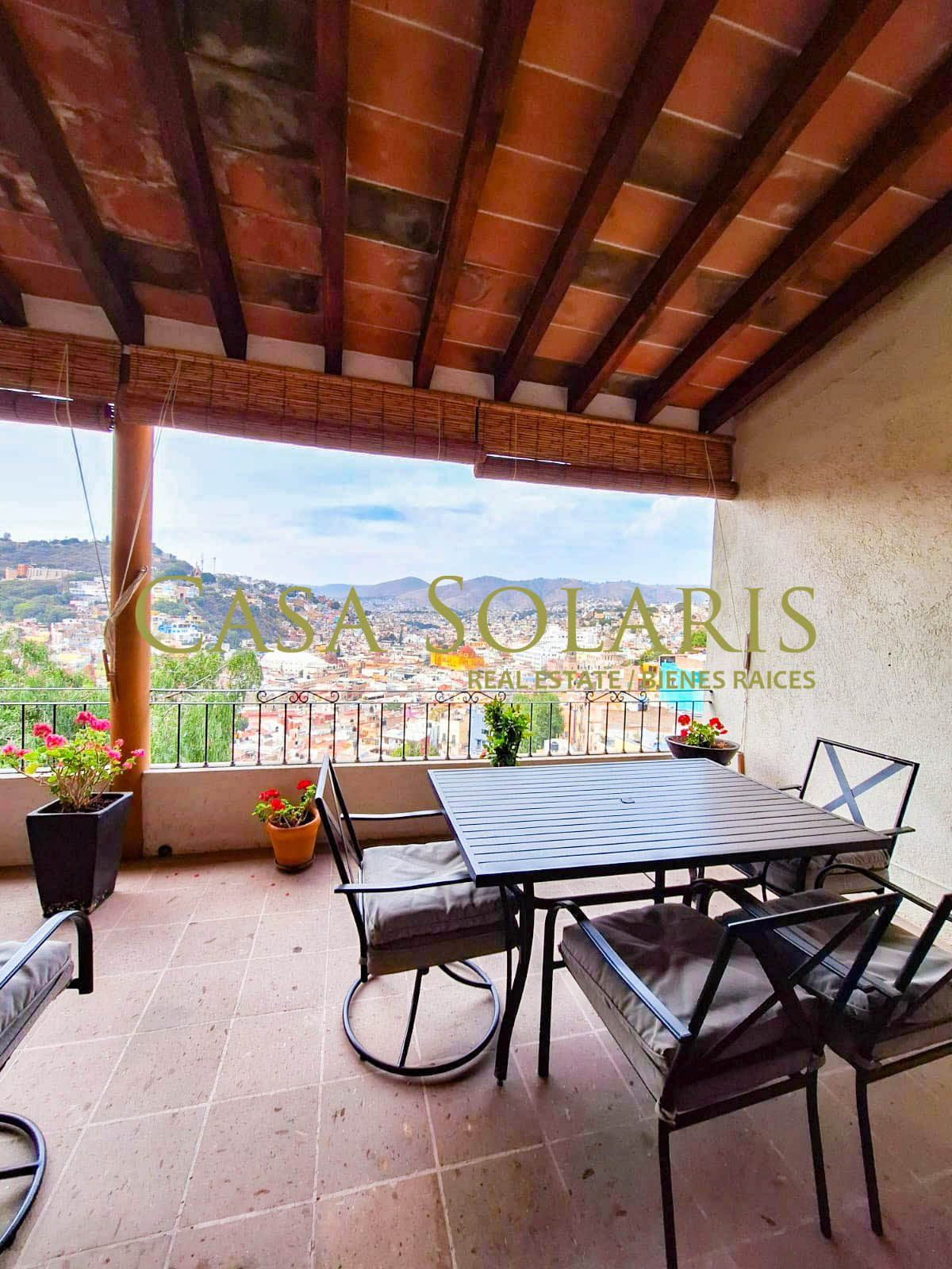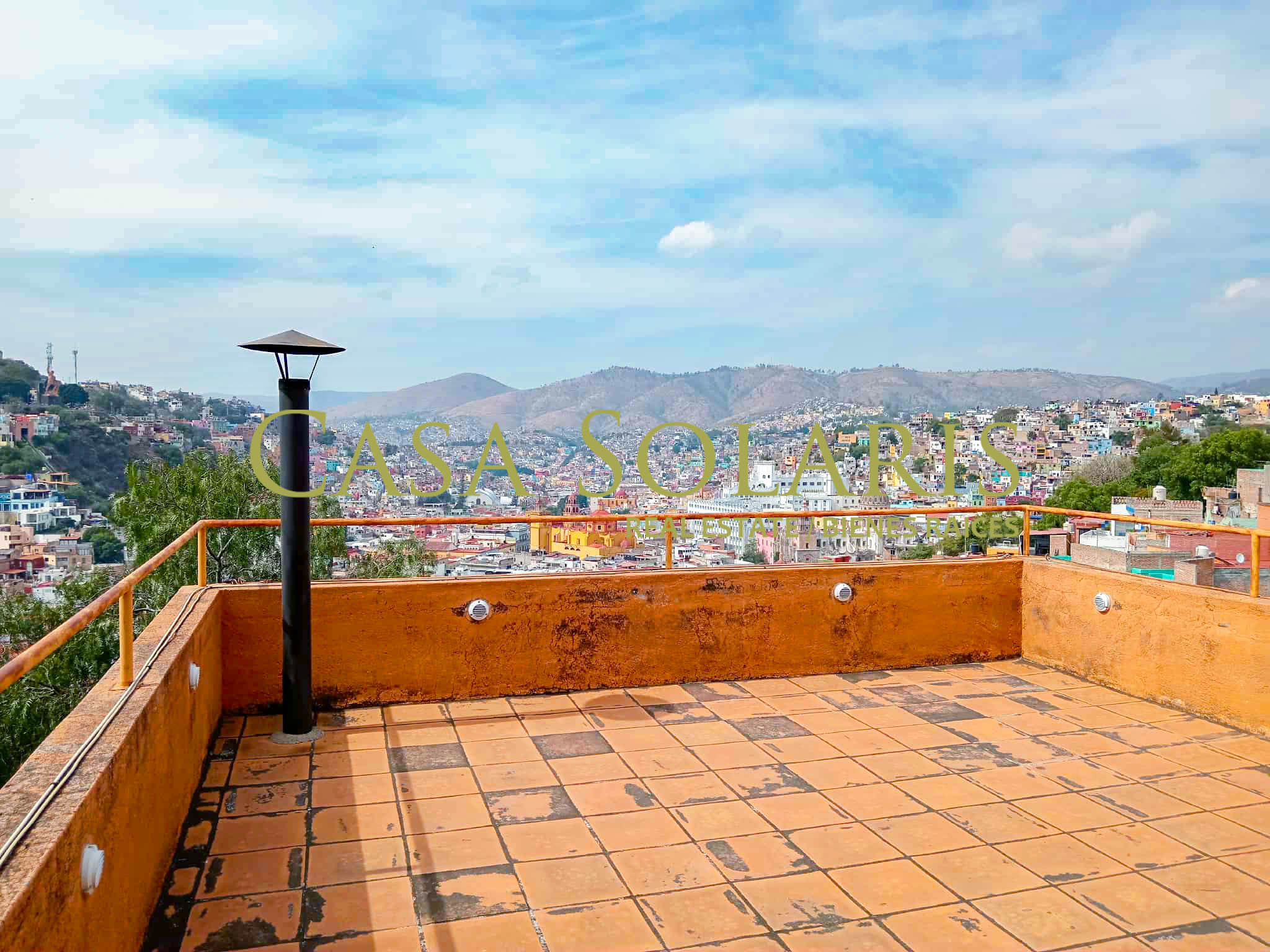 Oportunidad de residencia amueblada y equipada, en venta ubicada en una parte alta donde se aprecia de forma increíble una vista del Centro de la ciudad de Guanajuato, con sus edificios emblemáticos: teatro Juárez, La Basílica, la Universidad, el mercado Hidalgo, el monumento al Pípila. Se ubica arriba del túnel noreste y para llegar a ella se disfruta el recorrido de un jardín con mucha vegetación y árboles. Cuenta con dos propiedades en el terreno, una casa y un departamento independiente. La casa con dos terrazas exteriores con vistas fabulosas tanto de día como de noche. Detalles de construcción la hacen muy especial como amplias bóvedas en una recámara y otra hermosa bóveda de cañón corrido que cubre el espacio de cocina y comedor, acabados rústicos, azulejo de talavera en los baños, y una bellísima escalera con piso de madera que conecta los pisos. Tiene una amplia cocina con mucha luz. Cuenta con dos recámaras en la primera planta, baño con centro de lavado, baño completo, terraza al frente y amplio jardín en la parte trasera. Se sube a la segunda planta donde se encuentra la alargada cocina para deleite de los que les agrada preparar comida, el comedor, un baño, La tercera planta es una terraza, donde se puede construir un departamento. El departamento se encuentra en la parte inferior de la casa, en una sola planta, con dos recámaras, cocina, sala y comedor, un baño y medio. Muy funcional, cómodo y equipado para tener una estadía muy confortable. La propiedad se emplea como negocio de bed&breakfast, por lo que también se puede seguir rentando con una buena ganancia, y tiene un historial muy rentable. Una gran oportunidad por su cercanía a la parte nuclear de la zona centro y por el estilo arquitectónico colonial moderna y la espectacular vista panorámica.